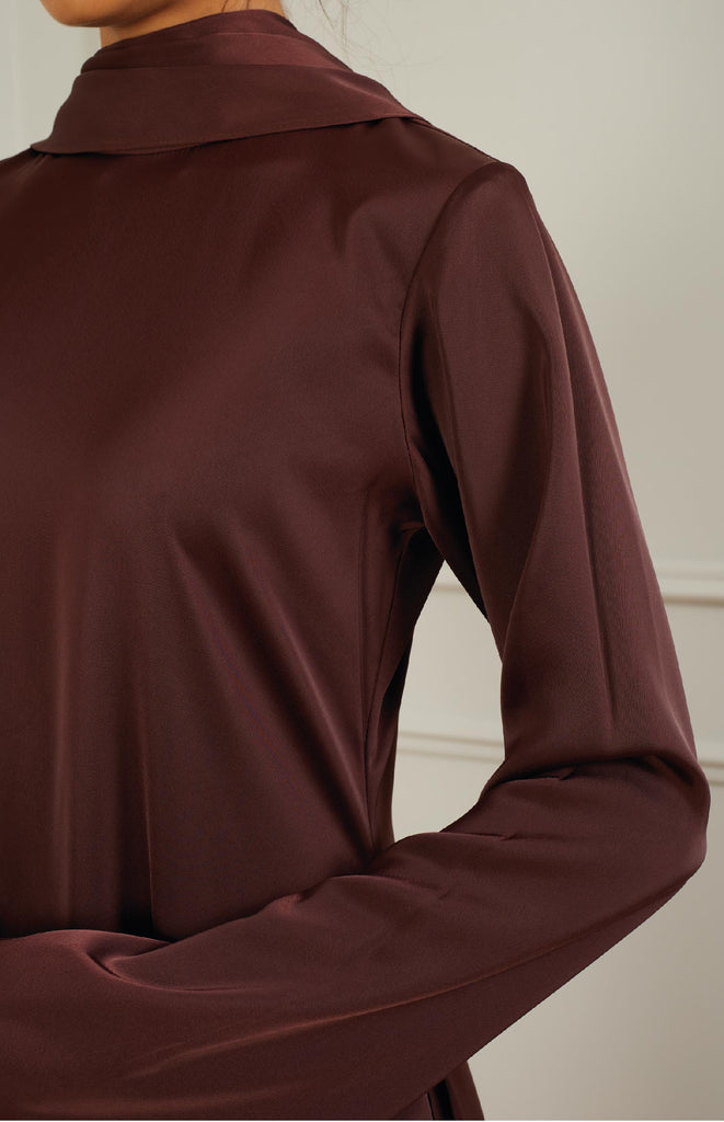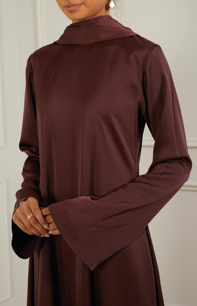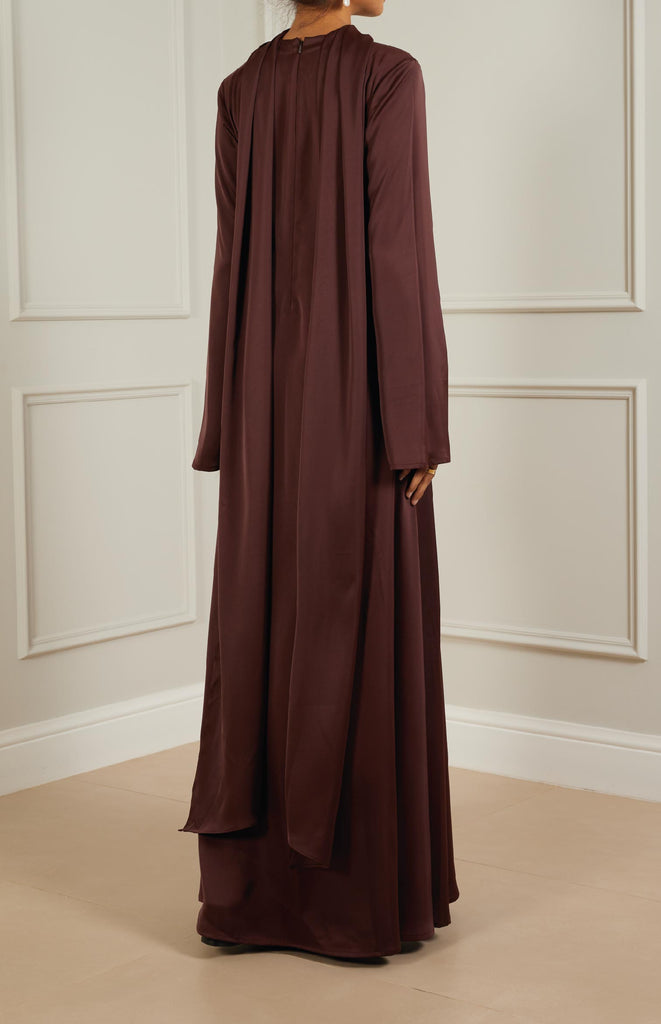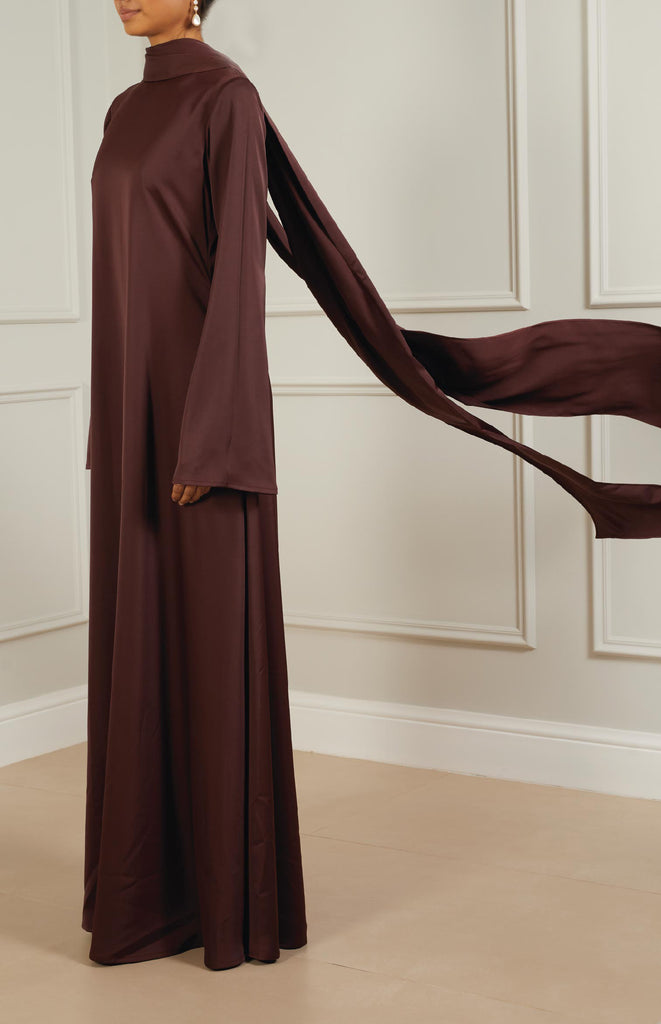 Refined straight silk kaftan with elegant sleeves, adorned with a silk scarf draping gracefully around the neck for added sophistication