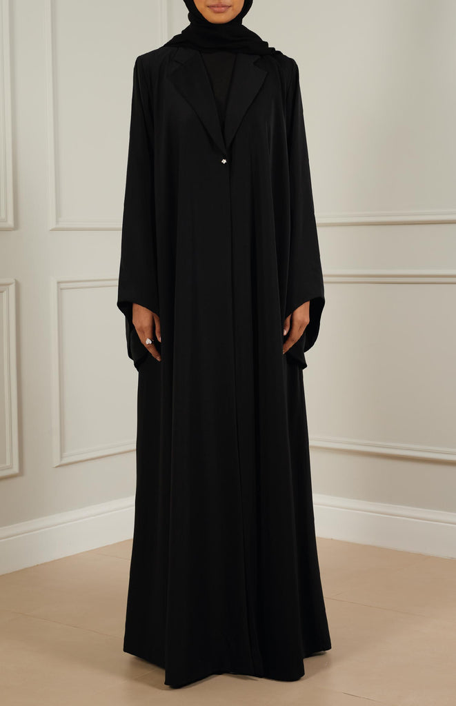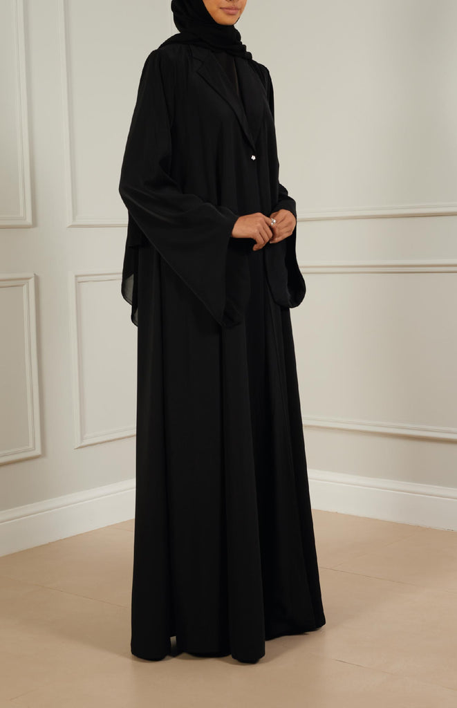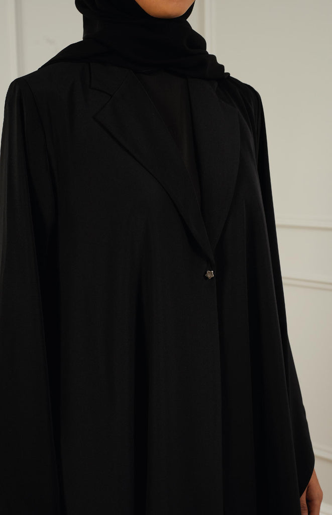Chic flair abaya crafted from soft, comfortable fabric, featuring stylish flair sleeves and collars. Adorned with a single star-shaped button for closure, adding a touch of elegance to the ensemble