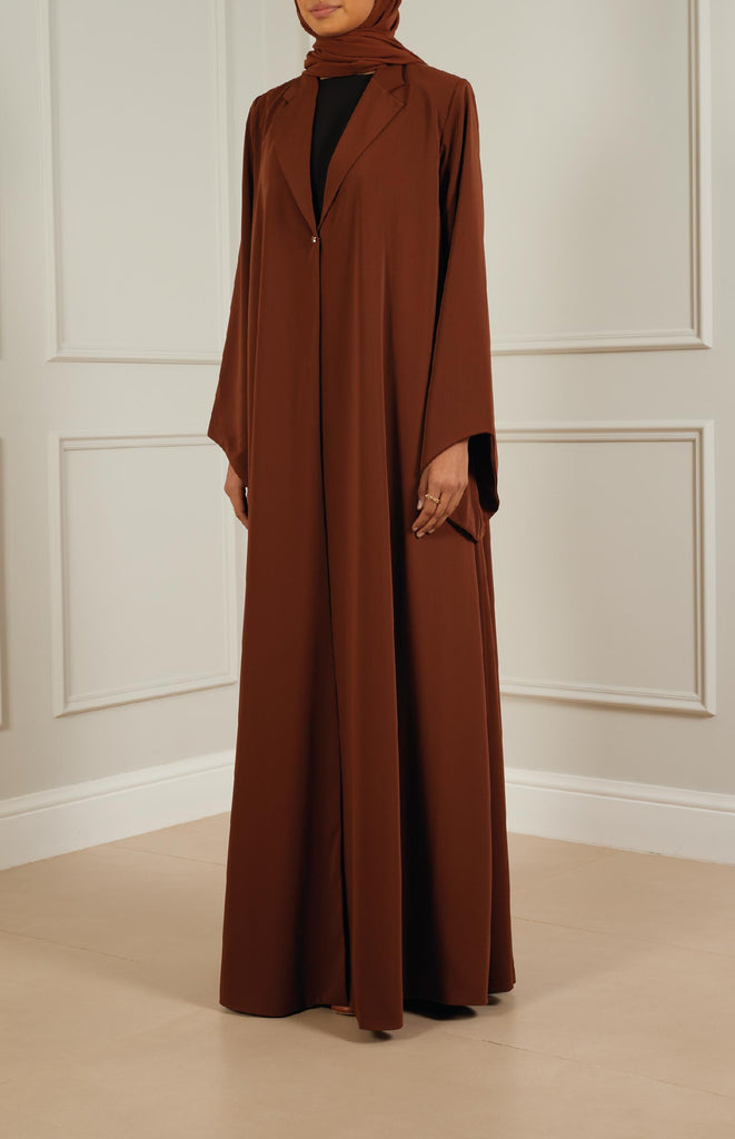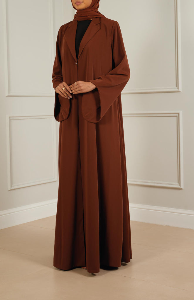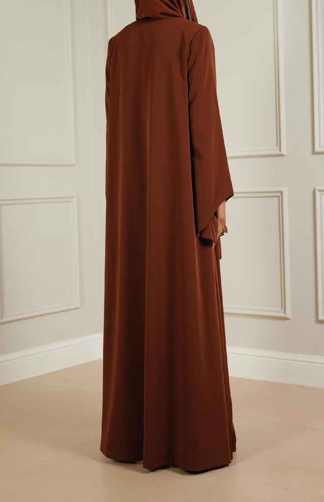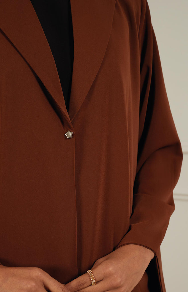 Chic flair abaya crafted from soft, comfortable fabric, featuring stylish flair sleeves and collars. Adorned with a single star-shaped button for closure, adding a touch of elegance to the ensemble
