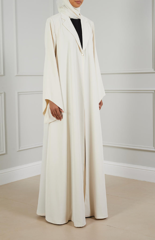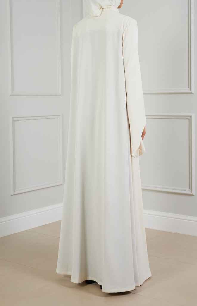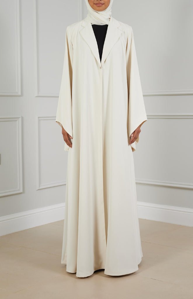 Chic flair abaya crafted from soft, comfortable fabric, featuring stylish flair sleeves and collars. Adorned with a single star-shaped button for closure, adding a touch of elegance to the ensemble