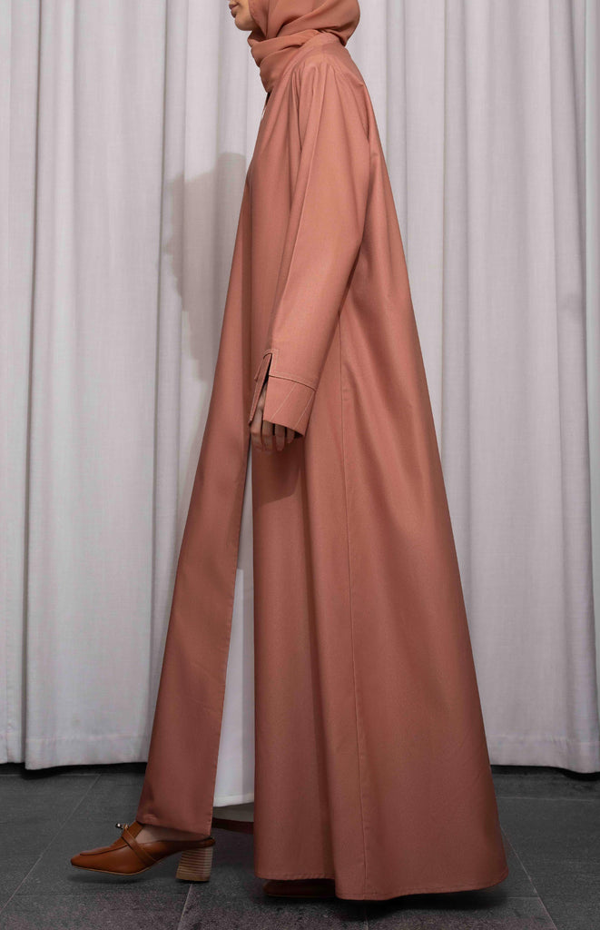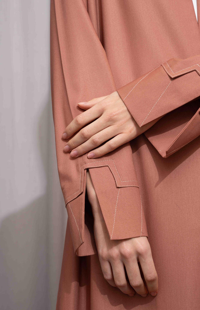 A refined cotton straight-cut Abaya, showcasing intricate beige thread stitching for a subtle touch of sophistication. The uniqueness of the sleeve cut adds a contemporary twist to the classic design, making it a versatile and stylish choice.