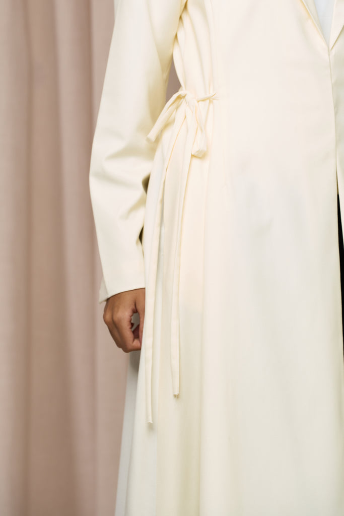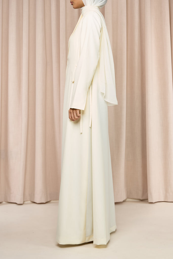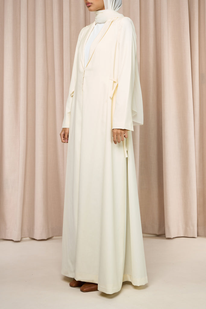 Mira – A wonder to behold, delicate yet striking. Chic suiting fabric abaya featuring two side-tying bows that elegantly cinch the waist. Structured yet feminine, it offers a flattering silhouette with a perfect balance of modest sophistication and modern style.