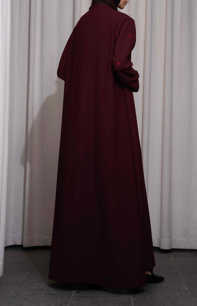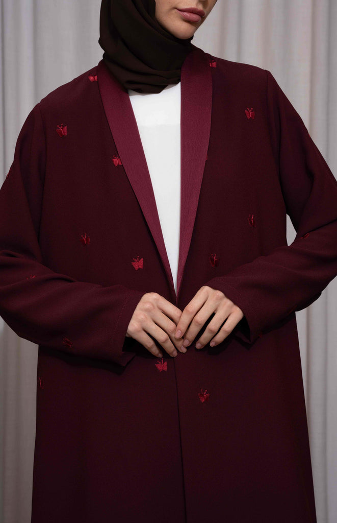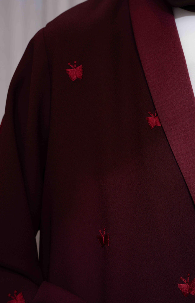 An exquisite Abaya crafted from luxurious double-sided fabric, adorned with intricate butterfly embroidery on the top section. The elegance is further accentuated by a flipped collar, adding a distinctive touch to this gracefully designed attire.