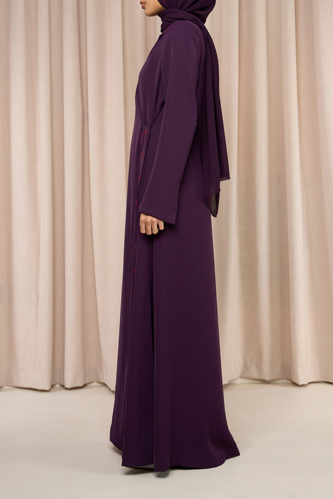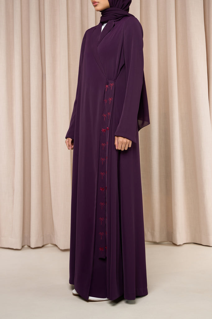Laya – The gentle shade under a graceful palm. Elegant crepe abaya featuring delicate palm tree embroidery and a chic front-tying strap. Lightweight yet graceful, it blends modest sophistication with a subtle tropical charm for effortlessly stylish everyday wear.
