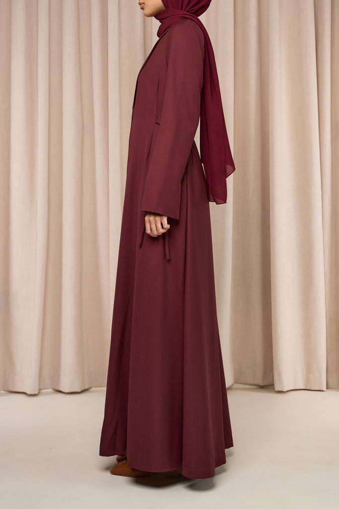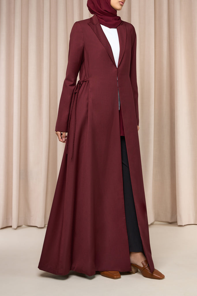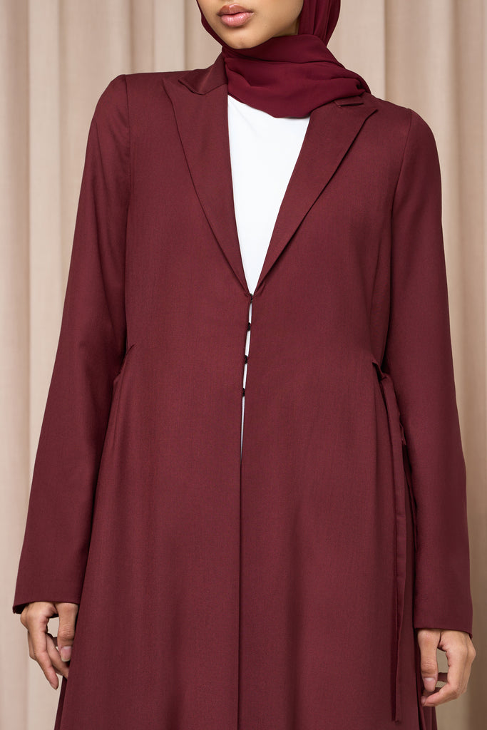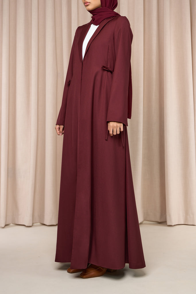 Mira – A wonder to behold, delicate yet striking. Chic suiting fabric abaya featuring two side-tying bows that elegantly cinch the waist. Structured yet feminine, it offers a flattering silhouette with a perfect balance of modest sophistication and modern style.