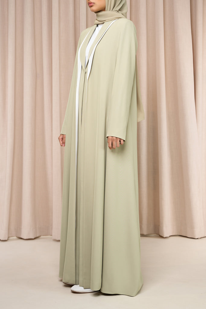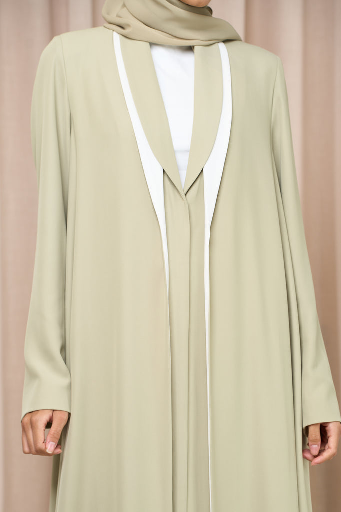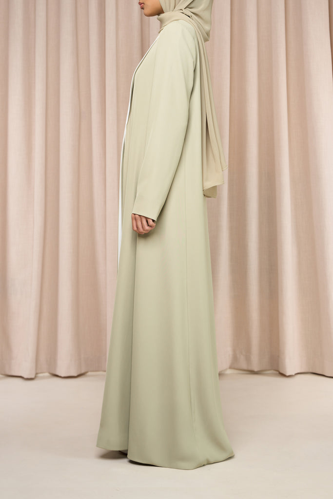 Ruwa – The freshness of water, serene and life-giving. Sophisticated crepe abaya with a unique double collar and sleek front closure. A-line body and a button in the front gives the abaya its finishing touch.