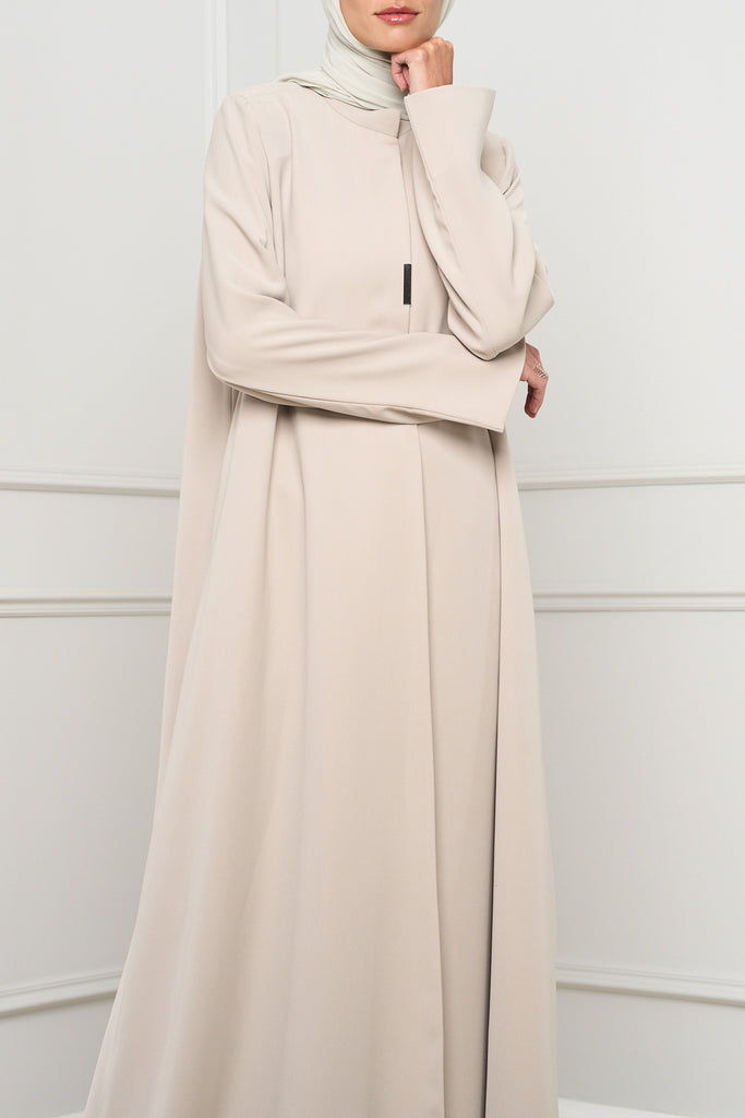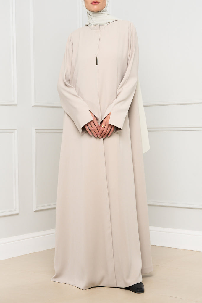 Elegant A-Line abaya crafted from soft crepe fabric, featuring subtle sleeve slits and two discreet inner buttons for a clean, flattering, and effortlessly modest silhouette.