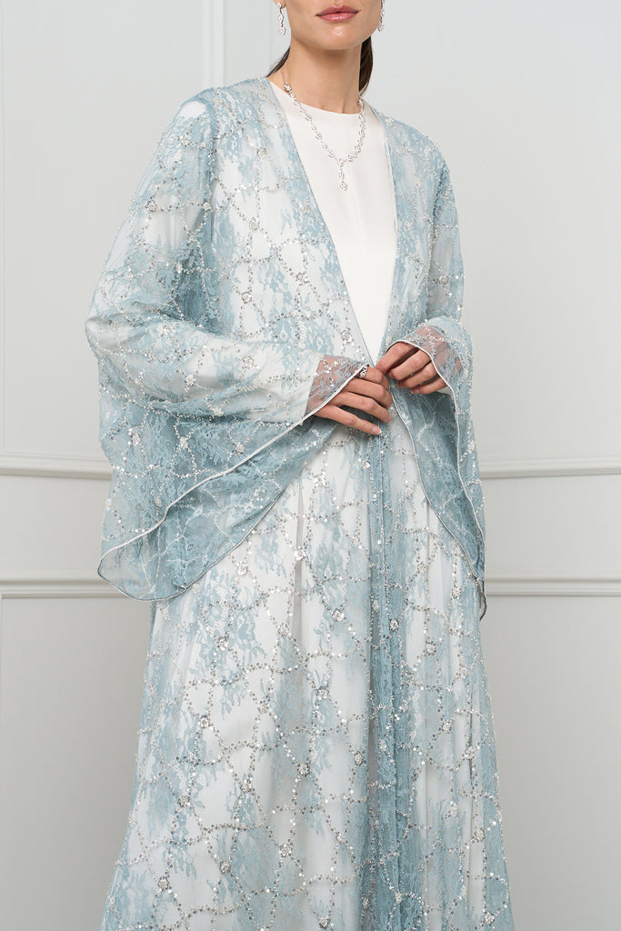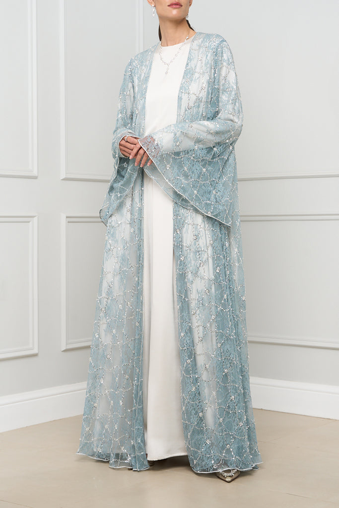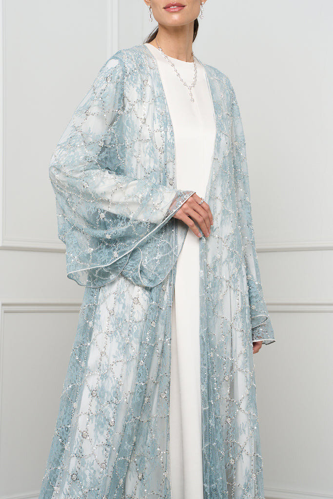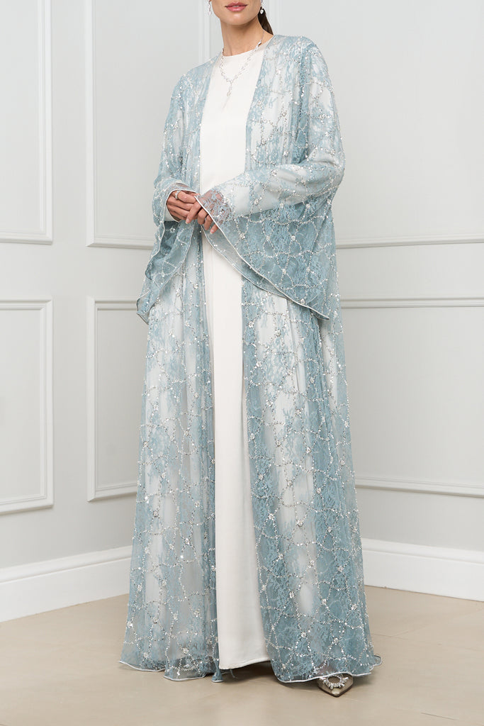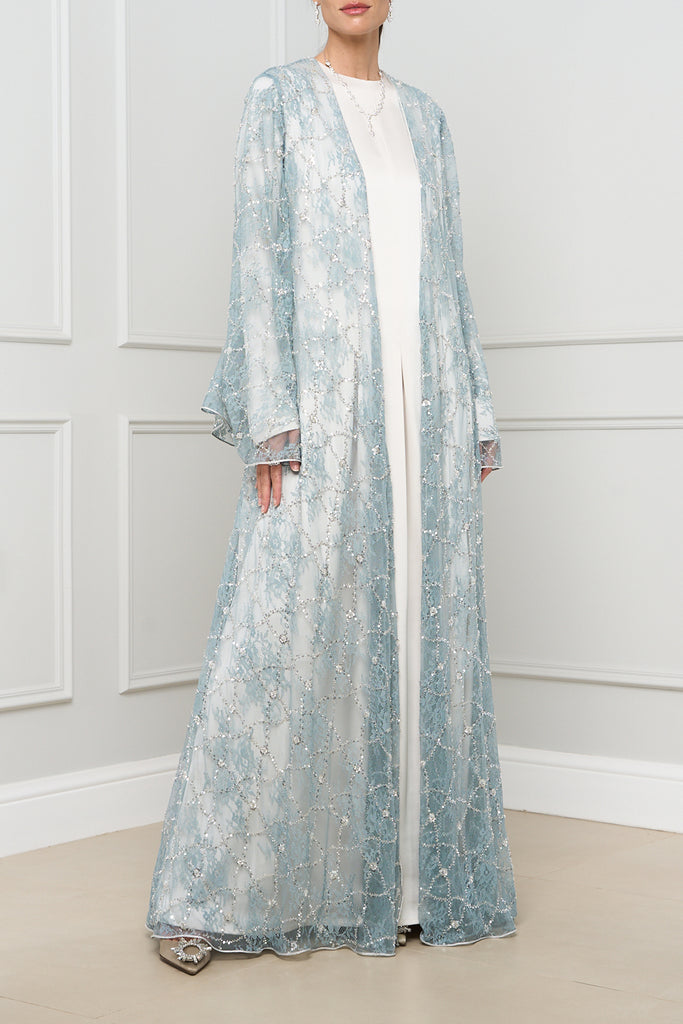 This exquisite open-front abaya features delicate lace detailing with shimmering embellishments, adding a touch of elegance and sophistication to any outfit.