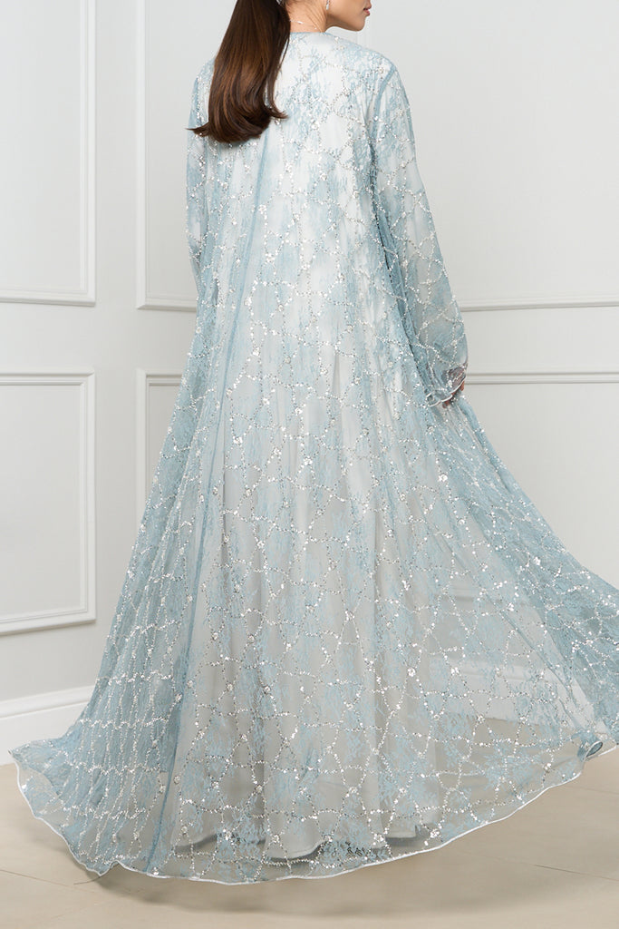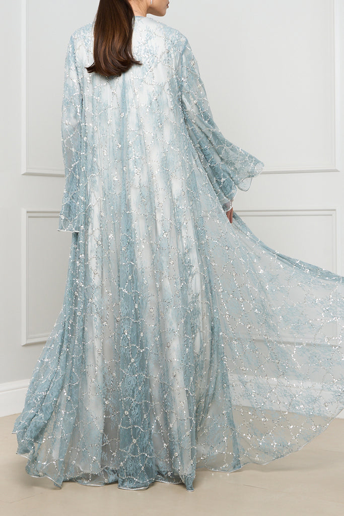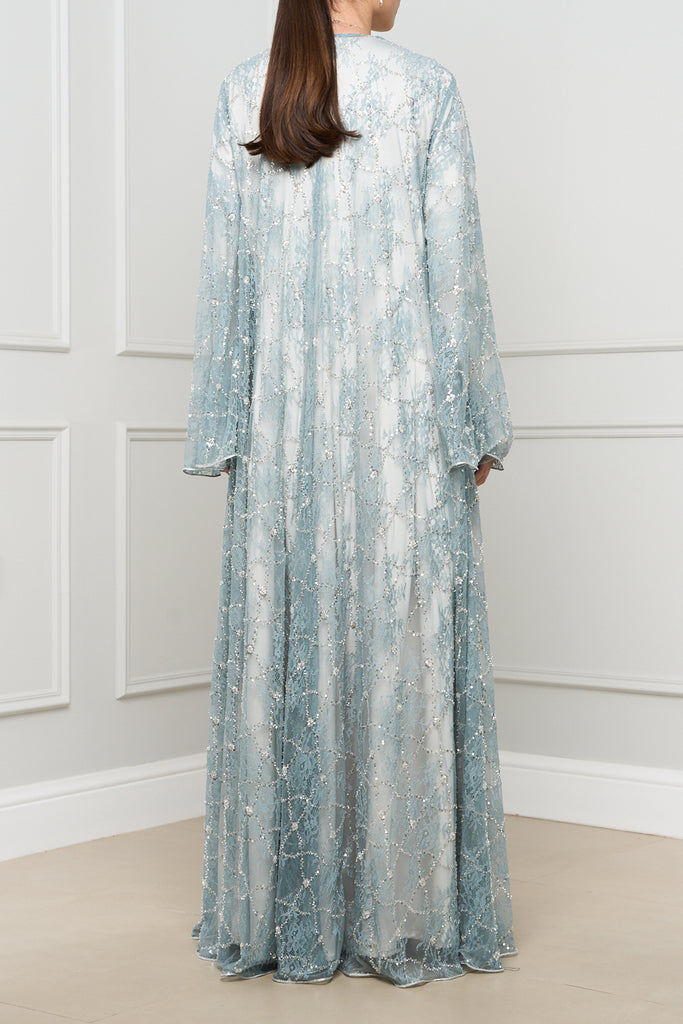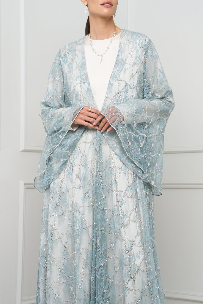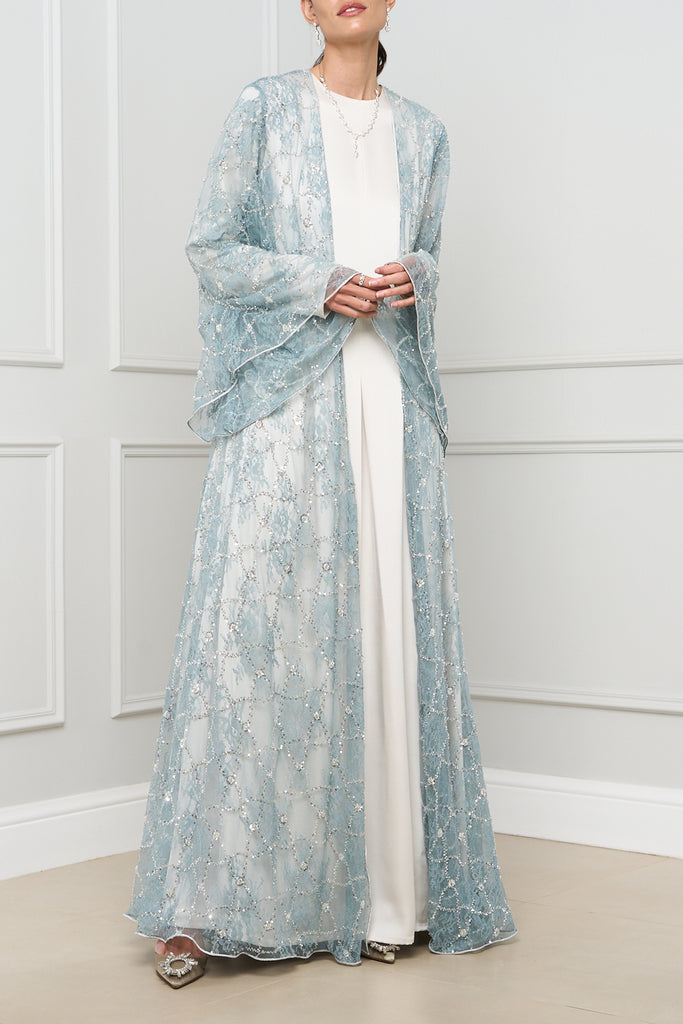 This exquisite open-front abaya features delicate lace detailing with shimmering embellishments, adding a touch of elegance and sophistication to any outfit.