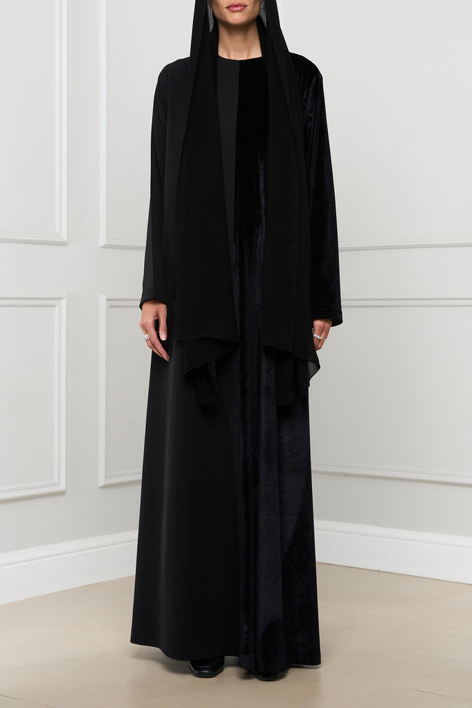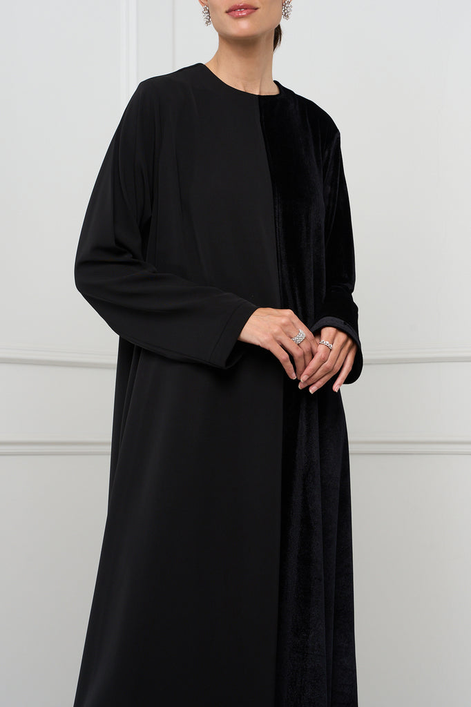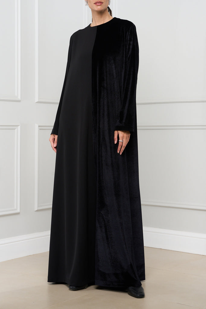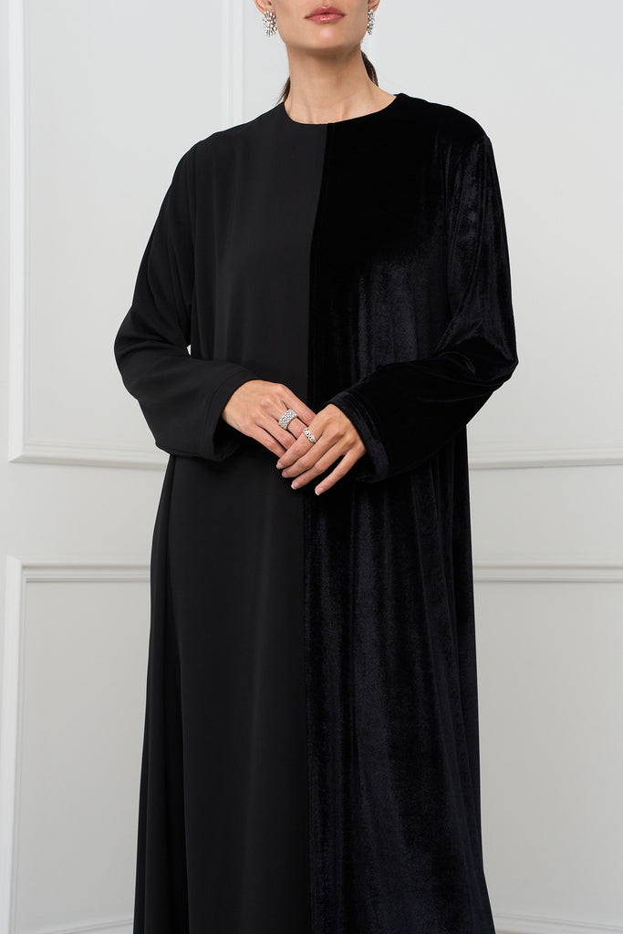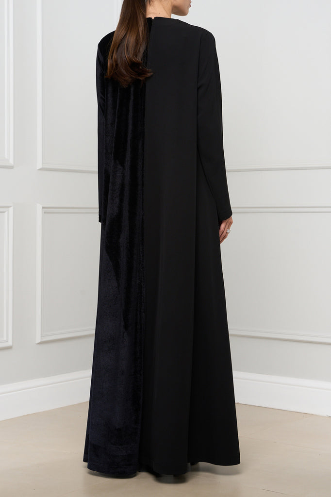 Elegant A-line kaftan combining rich velvet and soft crepe for a striking contrast. Effortlessly blends texture and flow for a timeless, graceful, and refined look.