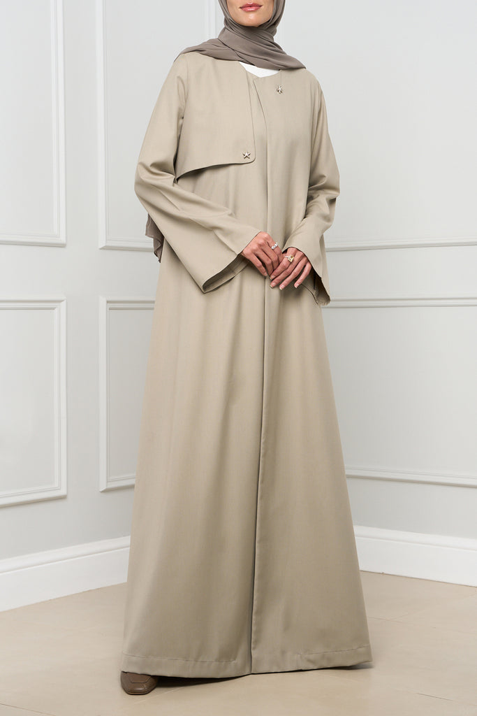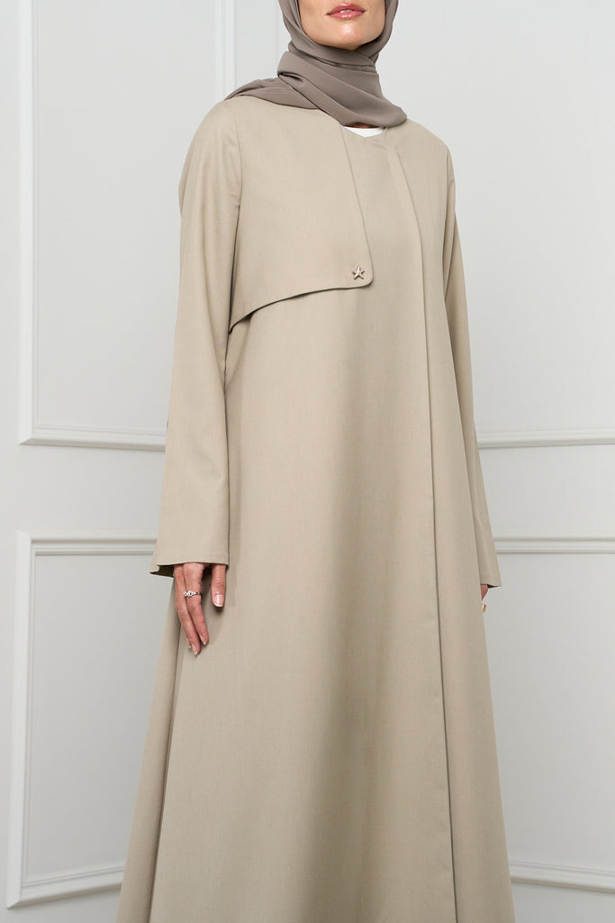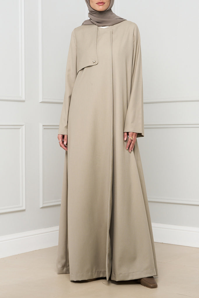 This elegant abaya features star embellishments and a layered flap detail, offering a timeless and graceful look.