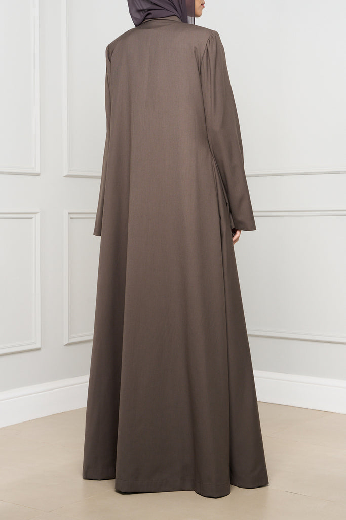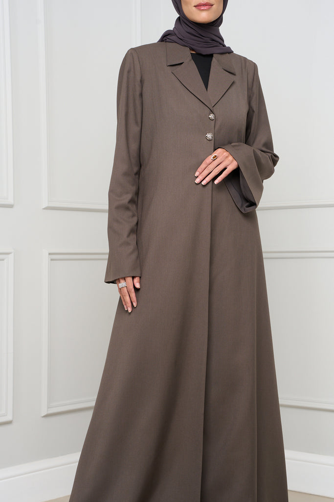Blazer-style A-line abaya in structured suiting fabric, featuring a sleek silhouette and two front buttons. A modern, polished take on everyday modest dressing.