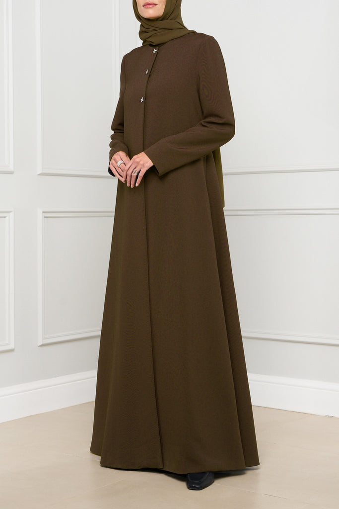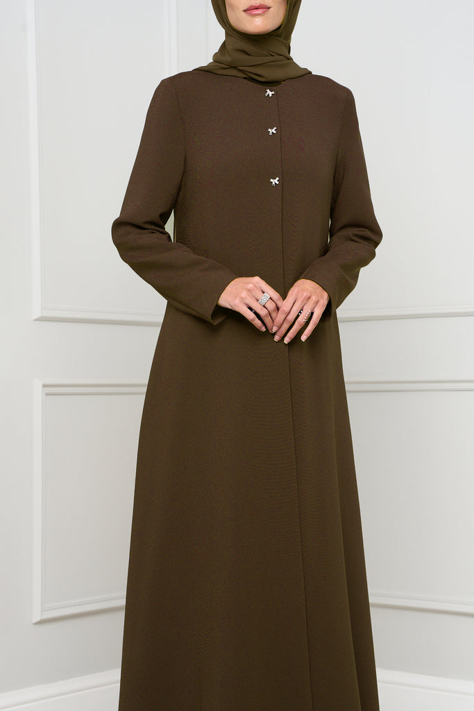 This elegant full-length abaya features a sleek A-line cut with delicate bow accents, crafted from premium, lightweight fabric for a refined and graceful look.