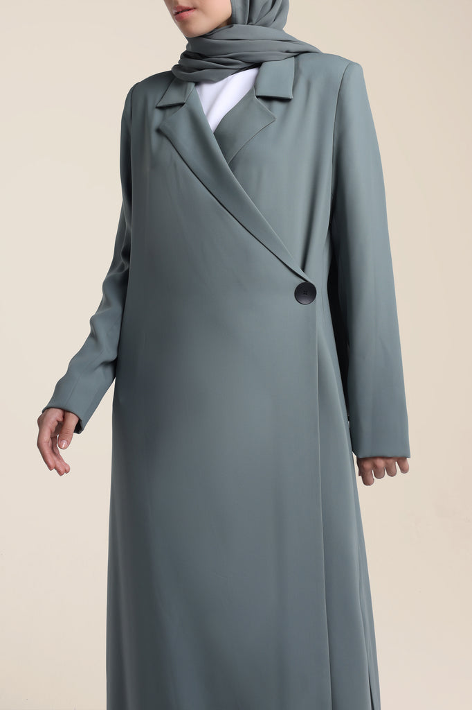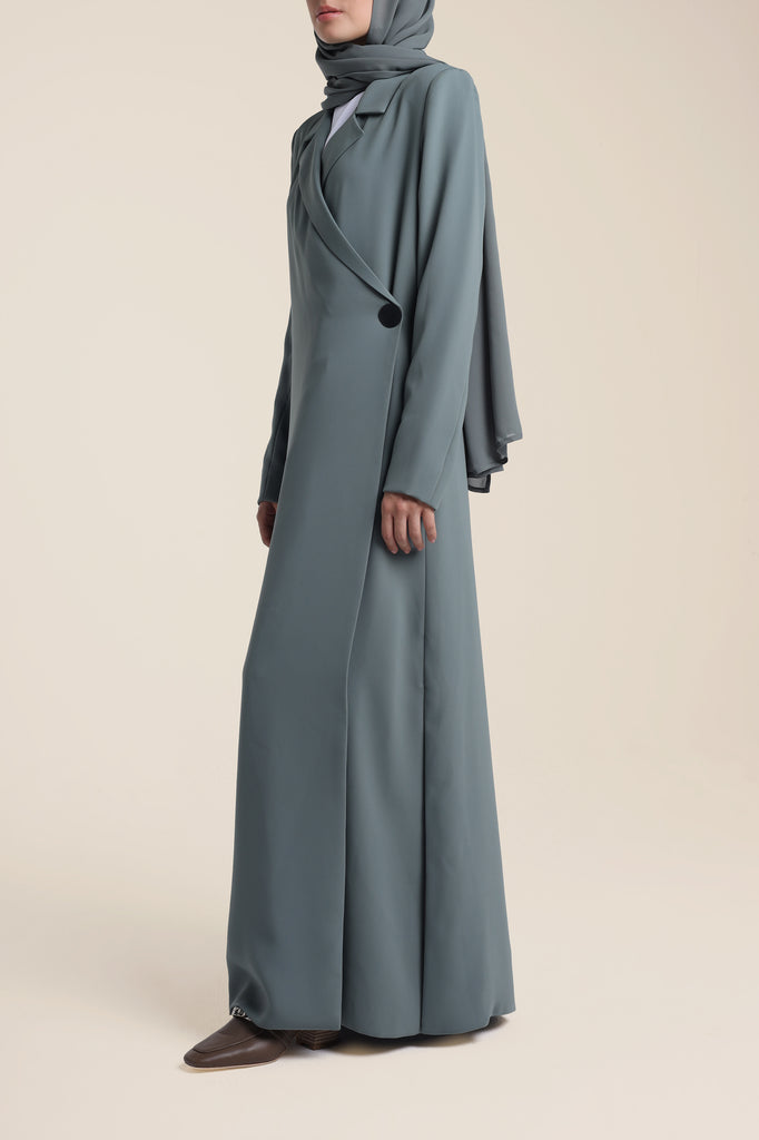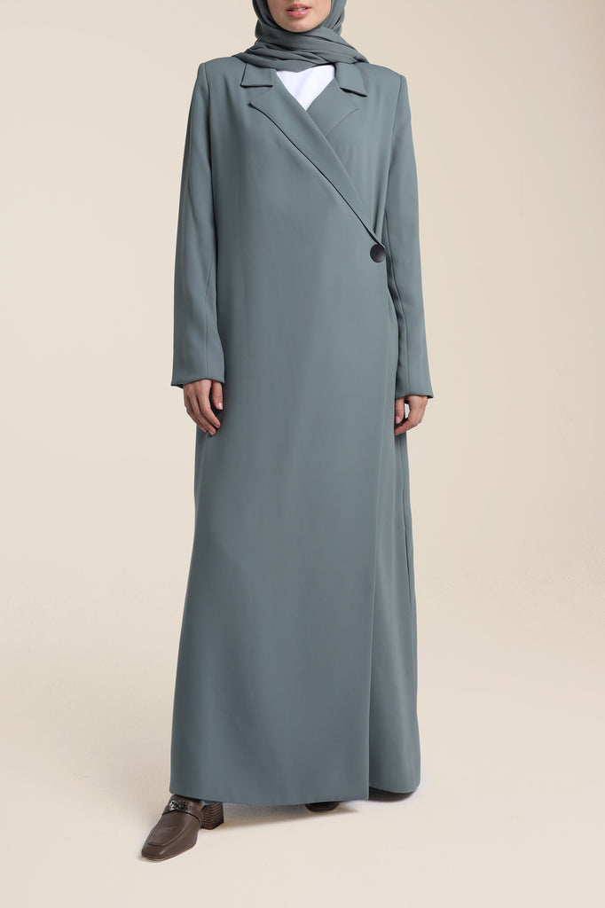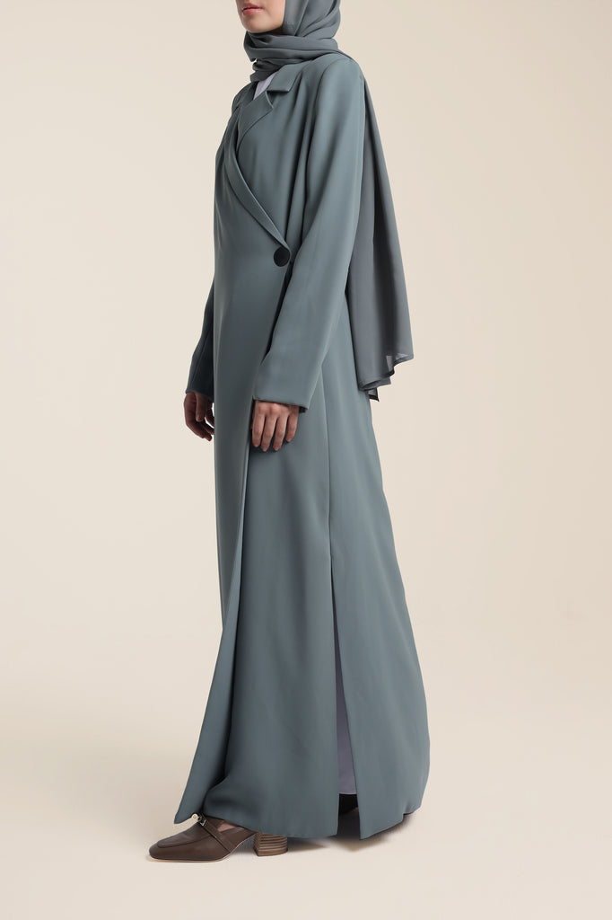 A classic wrap abaya with an elegant button on one side. Complemented by two slits on both sides; giving a feminine delicate hint.