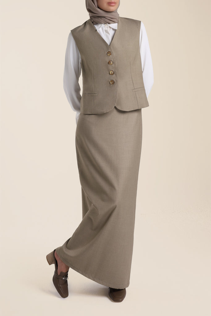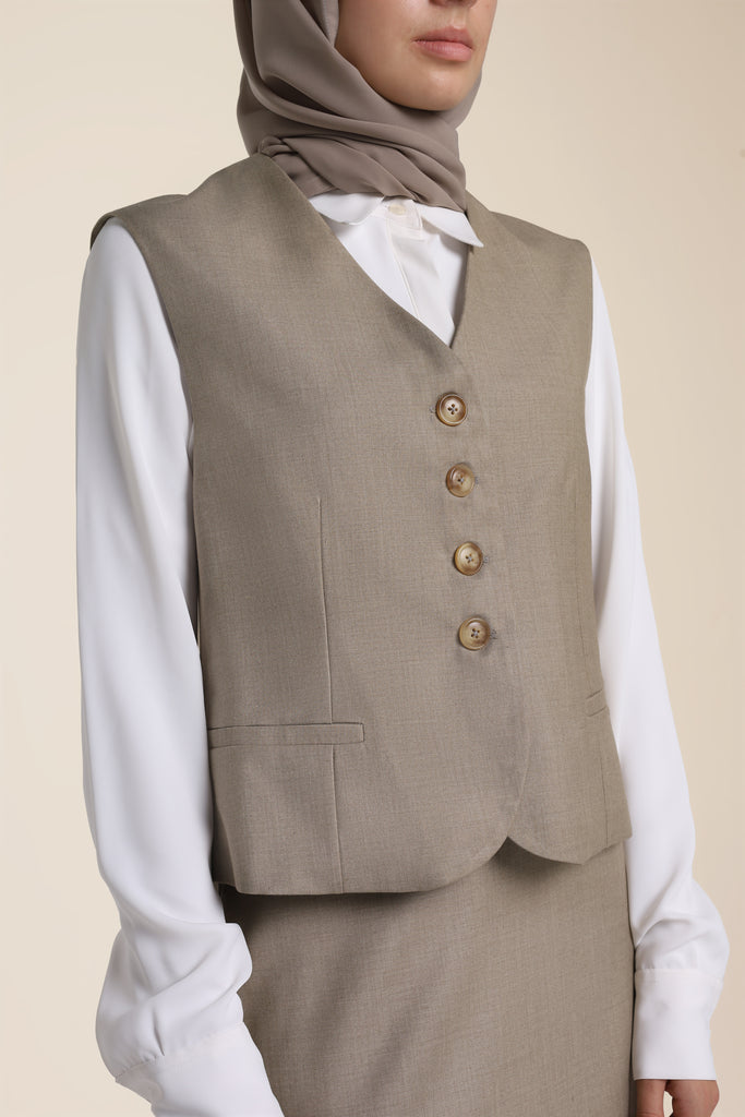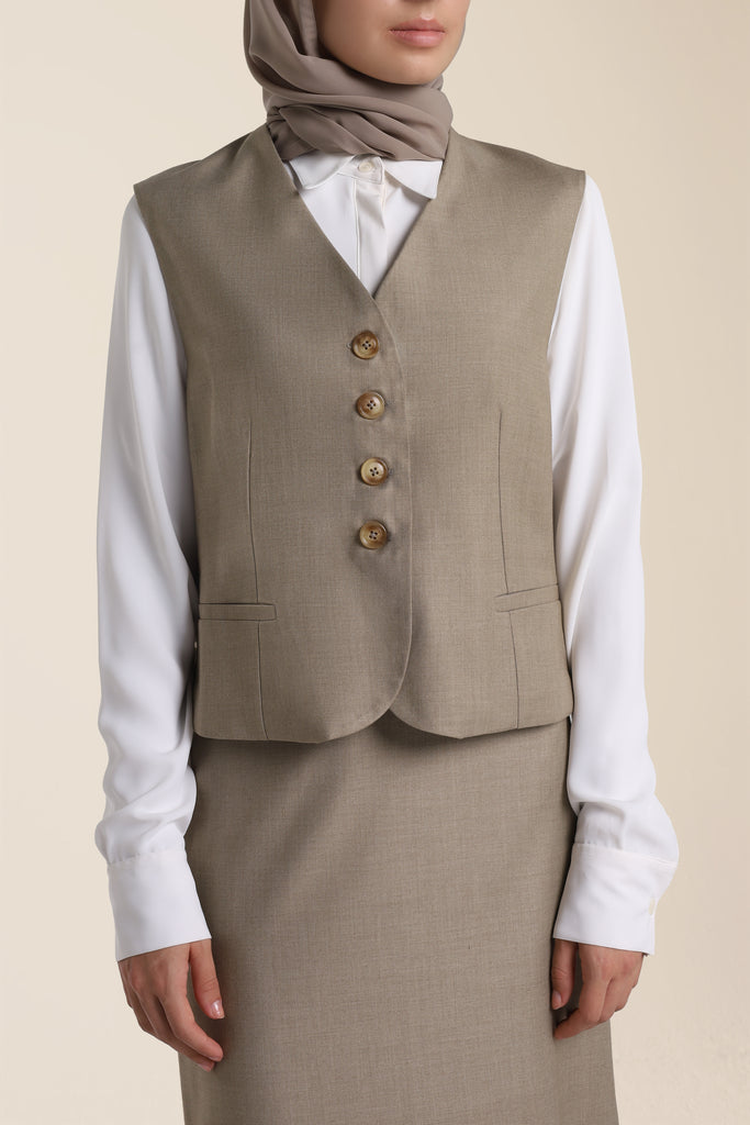 Embrace the latest tailoring trends and add a feminized vest to your wardrobe. Our vest is both cool and practical. It features four functional buttons at the chest, front welt pockets, and an adjustable back tab to create the preferred fit. Pair with tailored skirt and blazer to wear as a statement top for work and professional settings.