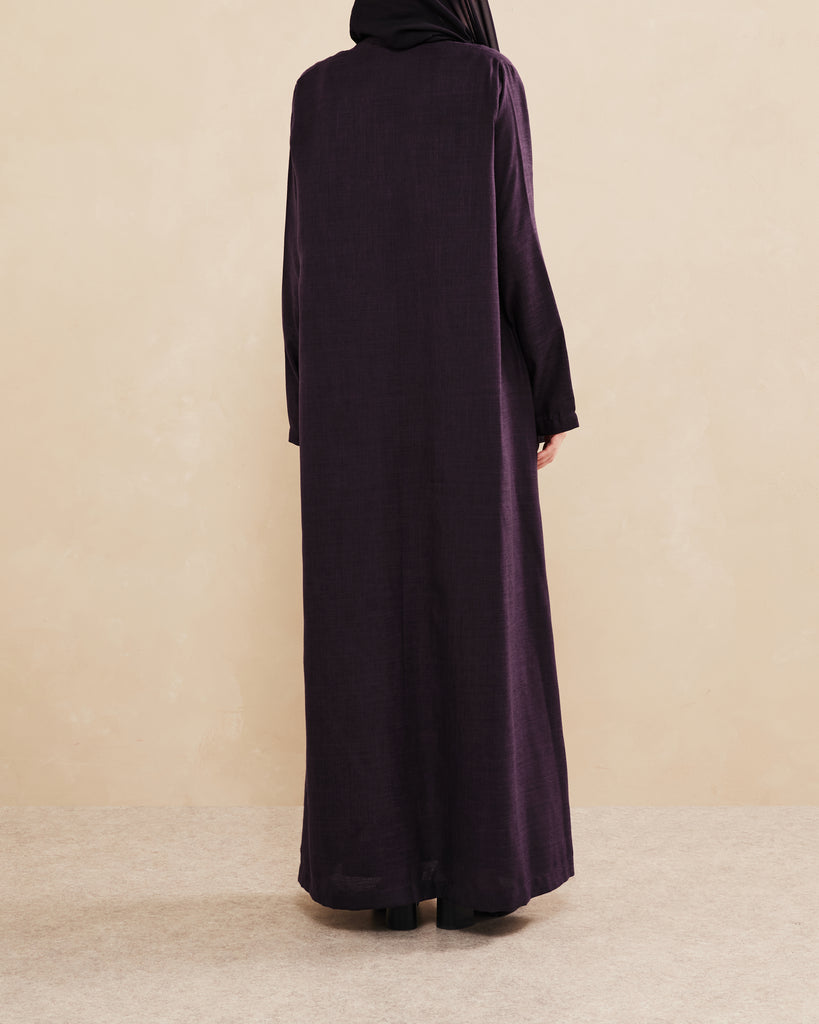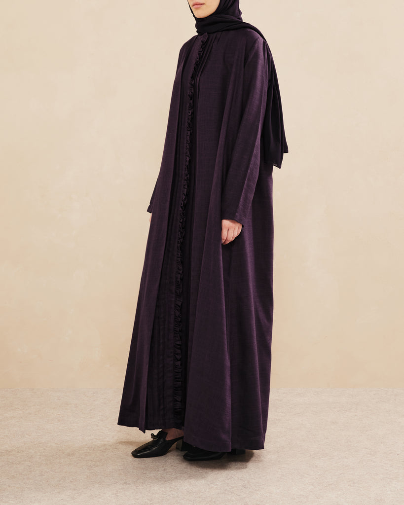 An abaya with delicate ruffle details along the front which also comes with a straight cut abaya sold together, offering a feminine and elegant style.