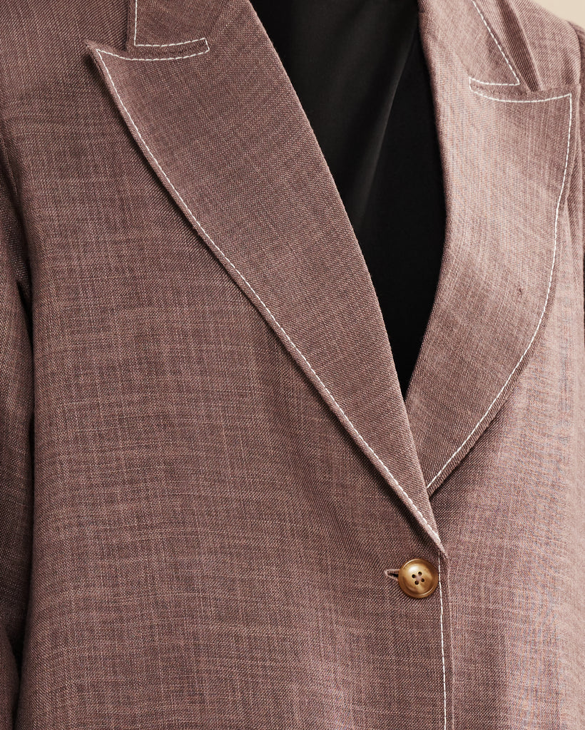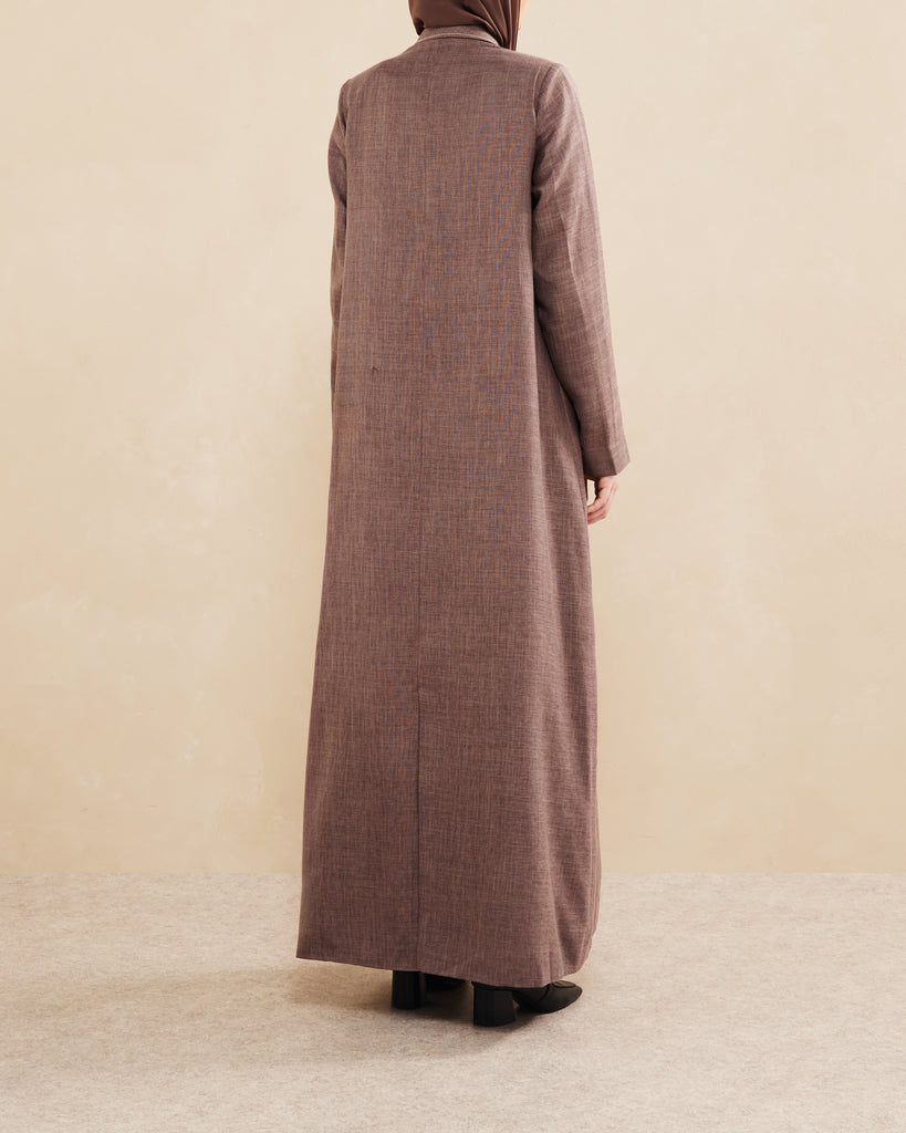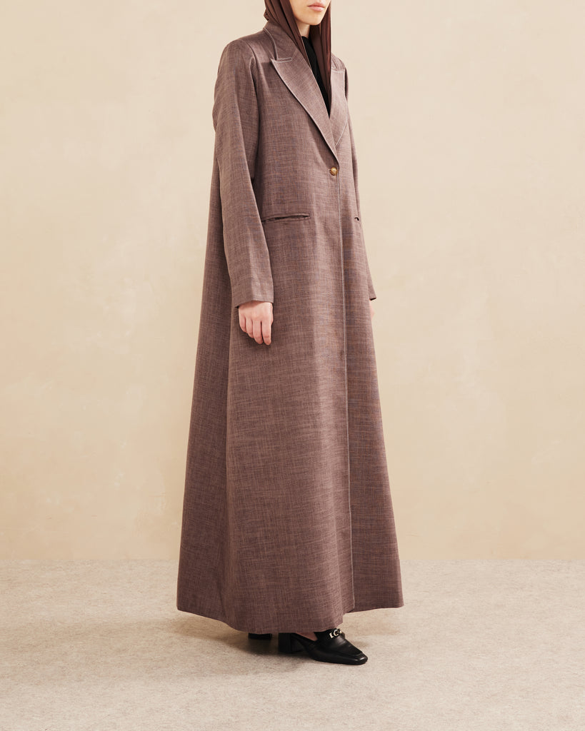 An abaya with a blazer-style front and single-button closure, combining traditional modesty with modern tailoring.