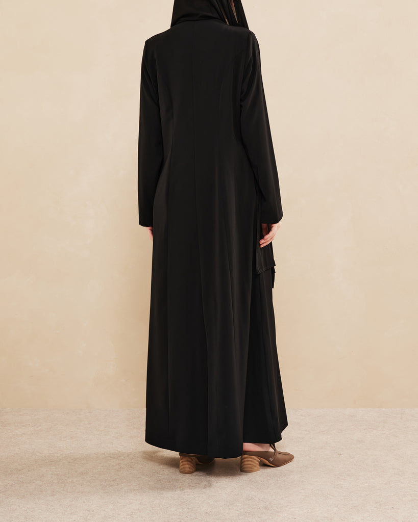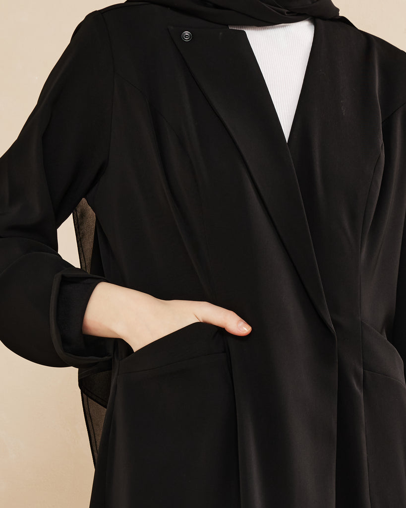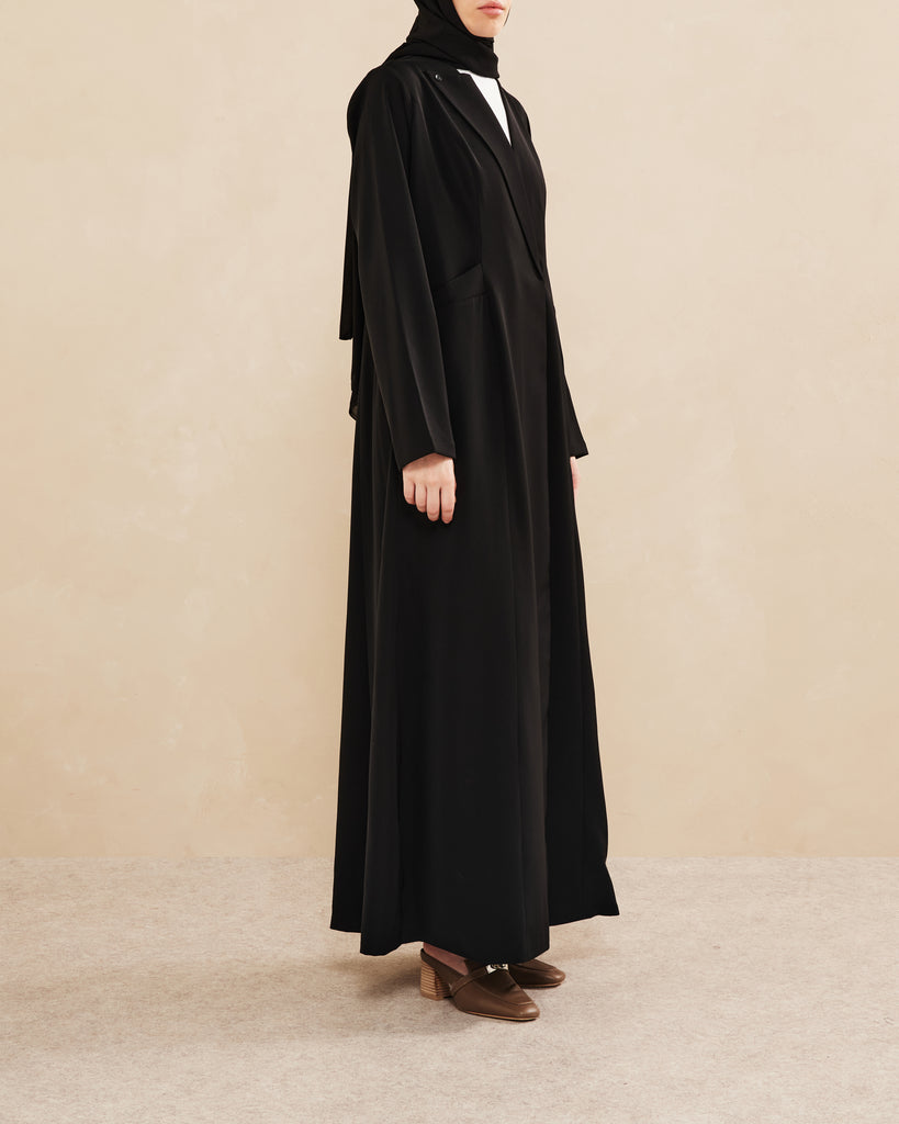 Elegant abaya featuring a sleek notched lapel, single button detail, long sleeves, tailored fit, and flowing full-length skirt. Smooth fabric enhances its sophisticated look.