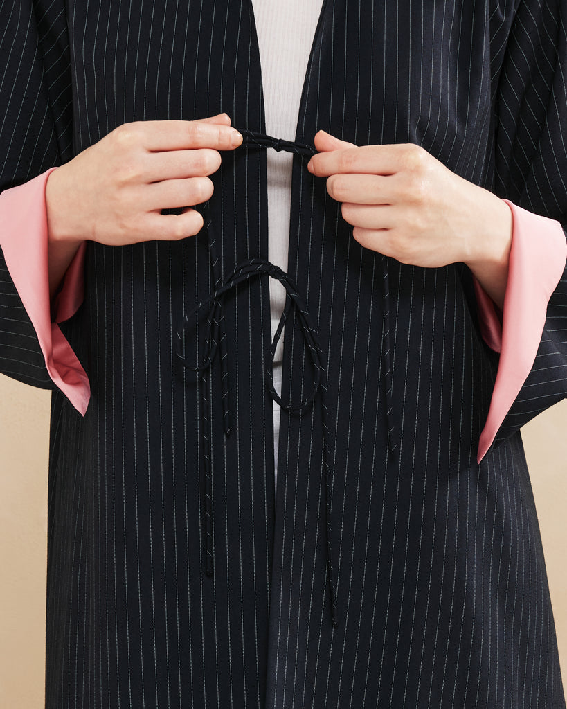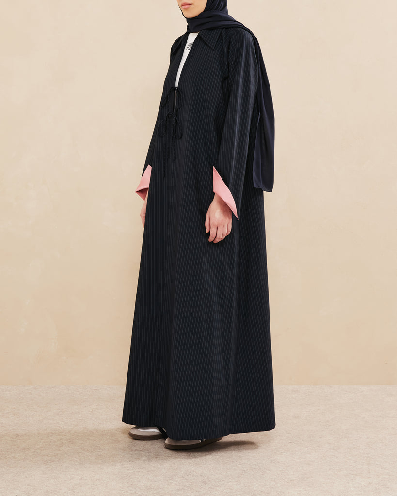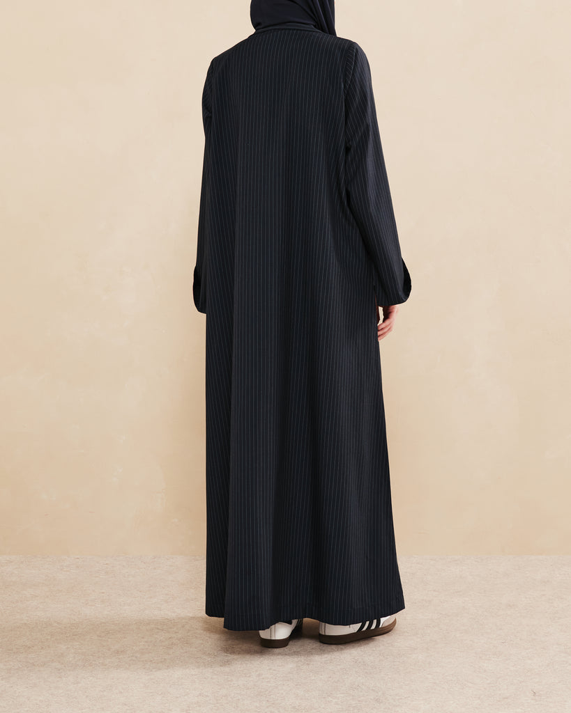 This pinstriped abaya in navy features a subtle inner lining, providing a sophisticated yet understated look