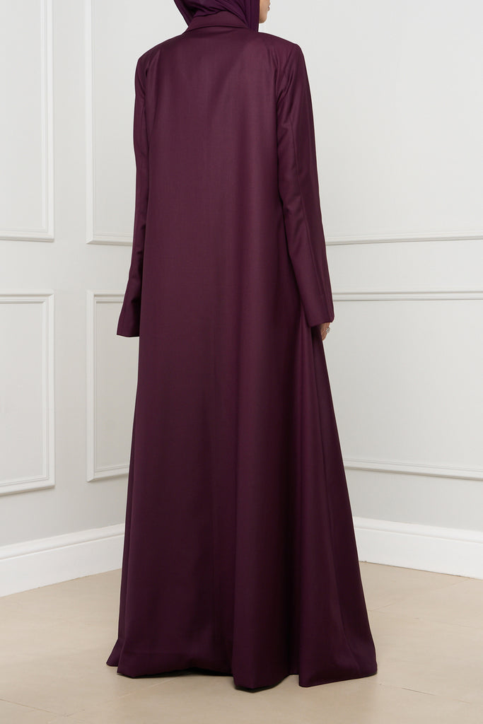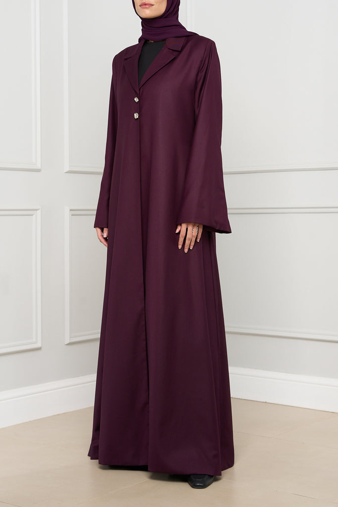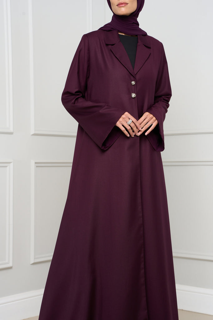 Blazer-style A-line abaya in structured suiting fabric, featuring a sleek silhouette and two front buttons. A modern, polished take on everyday modest dressing.